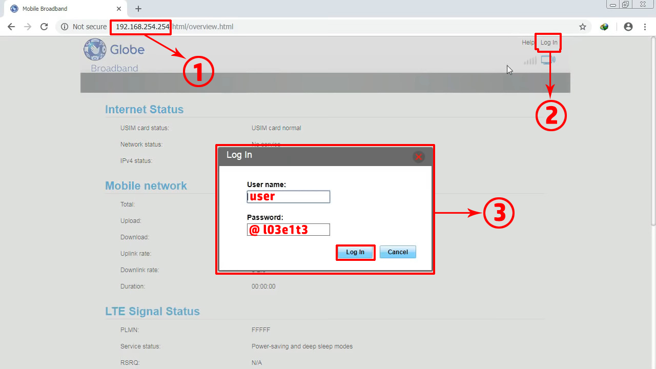 Step 1: Open 192.168.254.254 in your browser. Click "Log in" at the top right corner of the page. Step 2: Enter your Globe at Home dashboard username and password. The default username is user and the password is @l03e1t3. If you forgot your password, you will have to reset the modem and login using the default password.