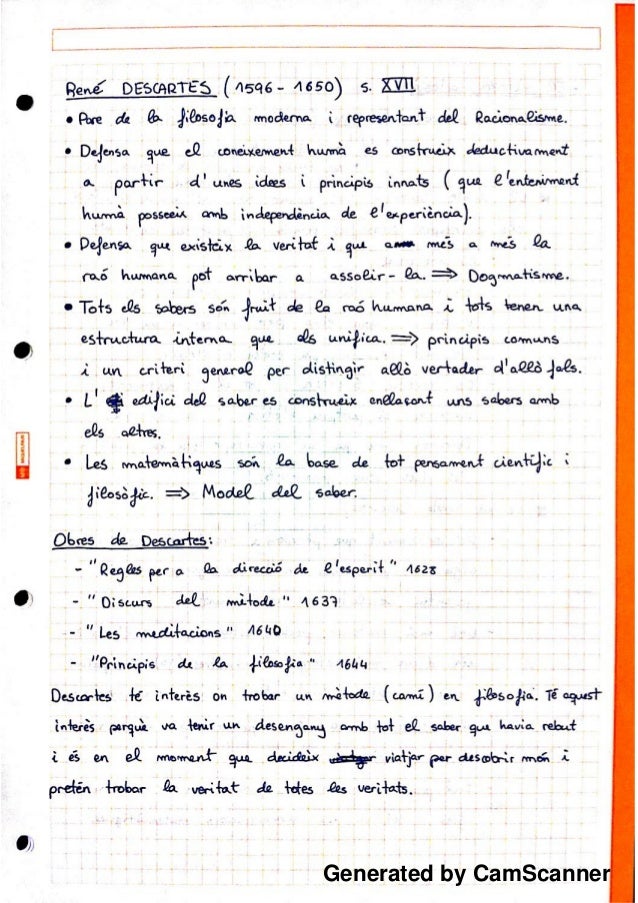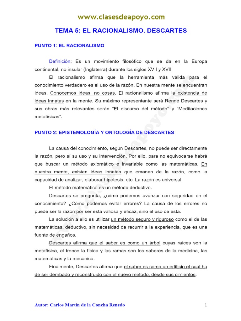 Resum René Descartes. Apunts 2n Batxillerat per la Selectivity. apunts filo els orígens de la modernitat descartes és racionalista (corrent filosòfic que afirma