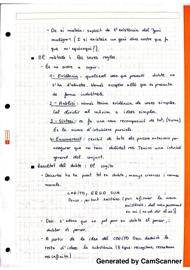 Apuntes de Descartes en los que se habla de El Método, sus reglas, La Duda Metódica, el Cogito, la Hipótesis del Genio Maligno, Dualismo Cartesiano, Existencia