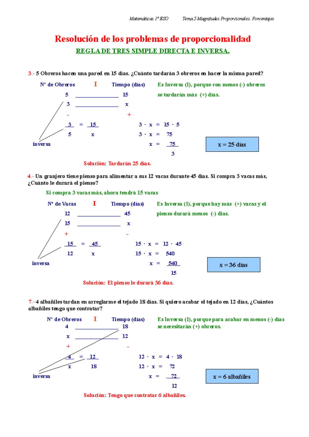 regla de tres inversa 3 . 5 Obreros hacen una pared en 15 días. ¿Cuánto tardarán 3 obreros en