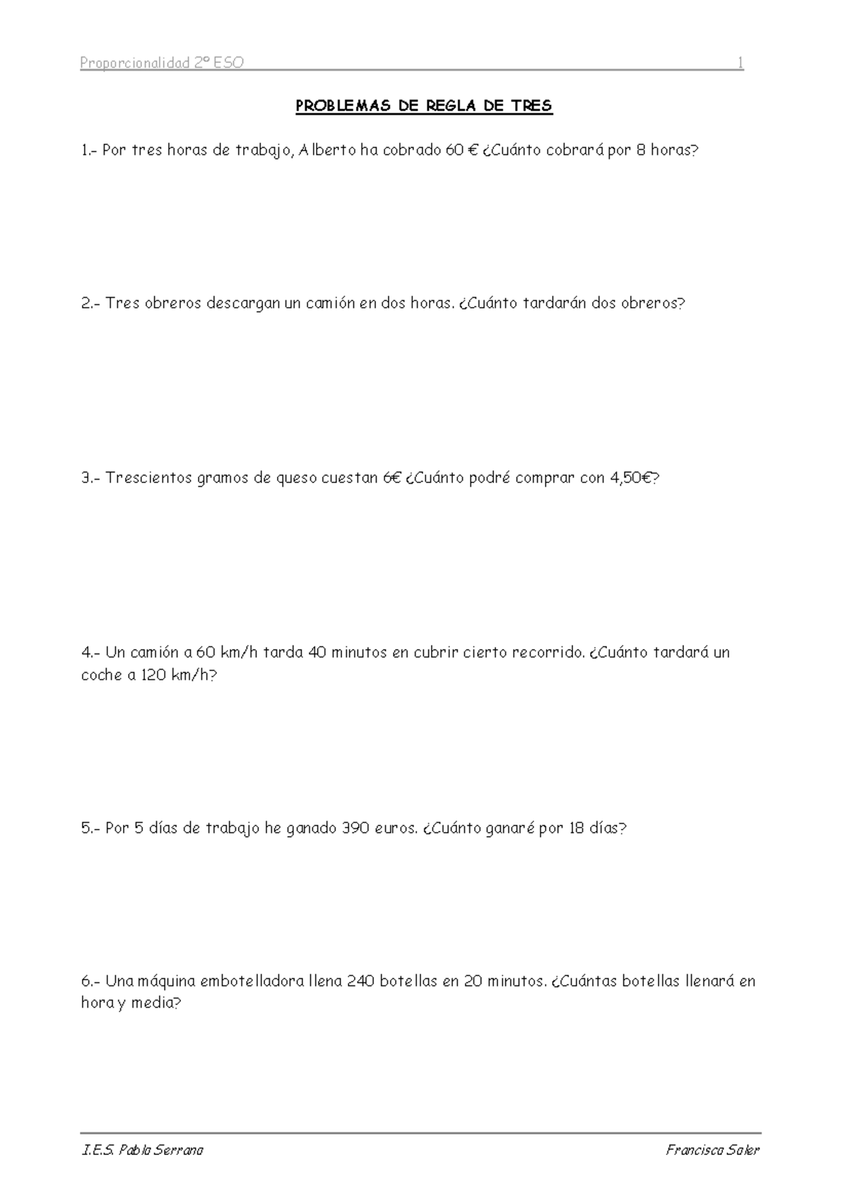 1.-. Por tres horas de trabajo, Alberto ha cobrado 60 € ¿Cuánto cobrará por 8 horas? 2.-. Tres obreros descargan un camión en dos horas. ¿Cuánto tardarán dos obreros? 3.-. Trescientos gramos de queso cuestan 6€ ¿Cuánto podré comprar con 4,50€? 4.-. Un camión a 60 km/h tarda 40 minutos en cubrir cierto recorrido.