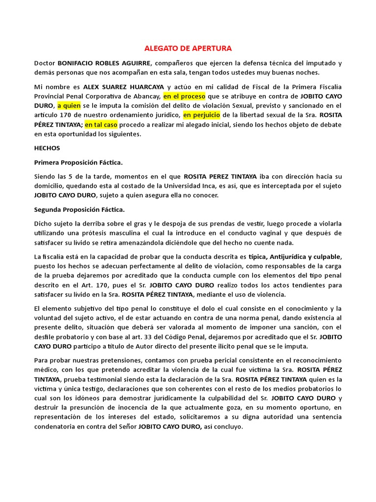 Audiencia de Juicio Oral. Alegatos de Apertura PDF Delito Derecho penal