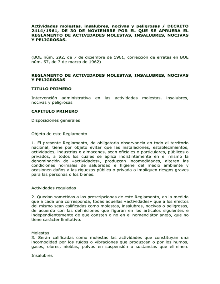 El Decreto 2.414/1961, de 30 de noviembre, por el que se aprueba el Reglamento de actividades molestas, insalubres, nocivas y peligrosas, indicaba en su art. 3: Actividades molestas: «Serán calificadas como molestas las actividades que constituyan una incomodidad por los ruidos o vibraciones que produzcan o por los humos, gases, olores.