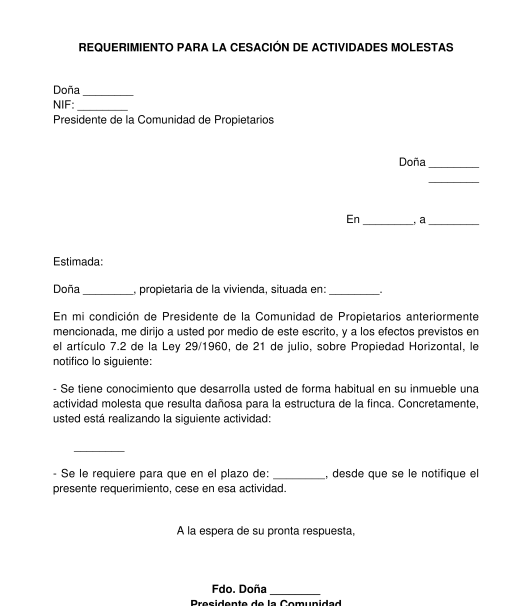 Para instar la demanda judicial de acción de cesación de actividades molestas del artículo 553-40 del Codi civil de Catalunya es necesario que la comunidad de propietarios requiera fehacientemente al propietario del inmueble para que deje de realizarlas. Si el inmueble está alquilado también debe requerirse al arrendatario. Con la demanda deberá aportarse el acuerdo de la junta de.