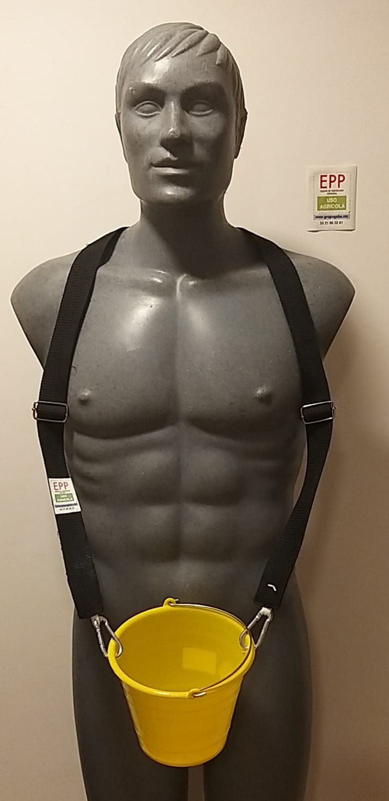 Capachos Cosecheros. Código: CC9LT. El Capacho Cosechero consiste en un balde de nueve litros con acolchado interior con goma eva, que se inserta sobre una argolla metálica, la cual se afirma por un arnés en X. Este tipo de capacho aumenta la eficiencia de la cosecha ya que el operador puede trabajar con más de un balde (hasta 5 baldes) lo.