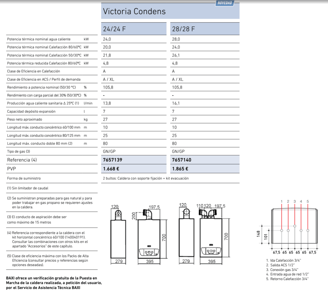 Baxi Victoria Condens. Modelos: 24 AF, 24/24 F, 28/28 F. La caldera Baxi Victoria Condens es un equipo mural mixto instantáneo, es decir, produce calefacción y agua caliente al momento. Aún siendo la caldera más sencilla de Baxi, cuenta con un quemador modulante con una capacidad de modulación de 1:5, es decir, tiene 5 niveles de.