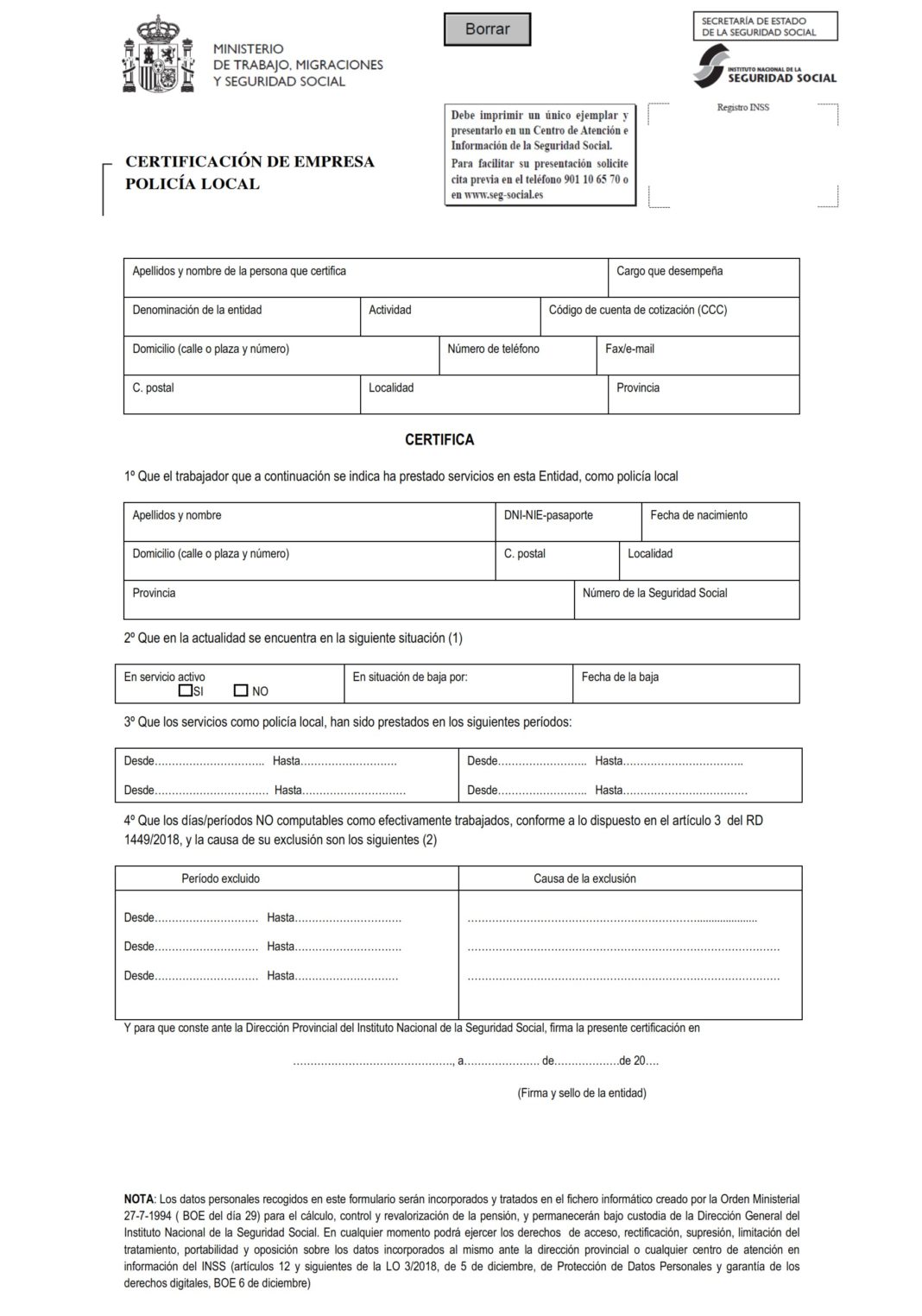 JUBILACIÓN CERTIFICADO EMPRESA POLICÍA LOCAL PARA SEGURIDAD SOCIAL