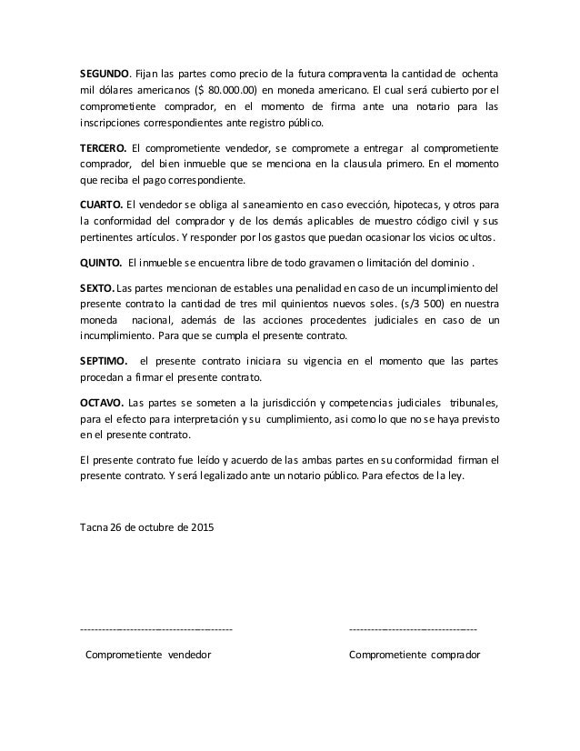 Un contrato de promesa de compraventa es que ambas partes en un fecha futura realizarán el compromiso mediante un contrato. Mediante este acto preliminar el comprador como el vendedor aseguran la formalización del acto y evitar que alguna de las partes se desista de la promesa. De tal modo que adquieren un compromiso y una obligación de.
