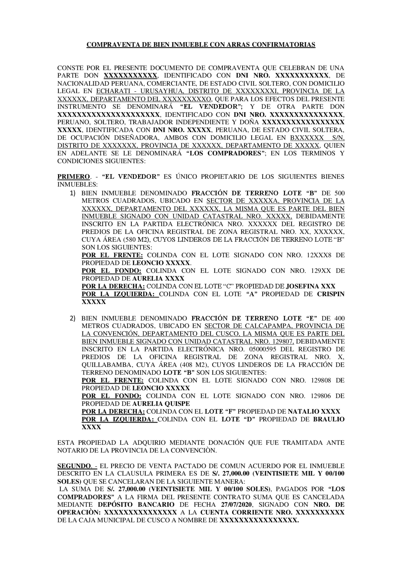 MODELO DE CONTRATO DE COMPRAVENTA DE BIEN INMUEBLE CON ARRAS CONFIRMATORIA Transcripciones de