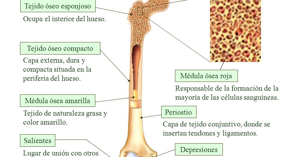 El hueso compacto forma la densa capa externa del hueso. Su unidad funcional es el osteón. El hueso compacto es muy duro y fuerte. El hueso esponjoso se encuentra dentro de los huesos y es más ligero y menos denso que el hueso compacto. Esto se debe a que el hueso esponjoso es poroso. La médula ósea es un tejido conectivo blando que produce.