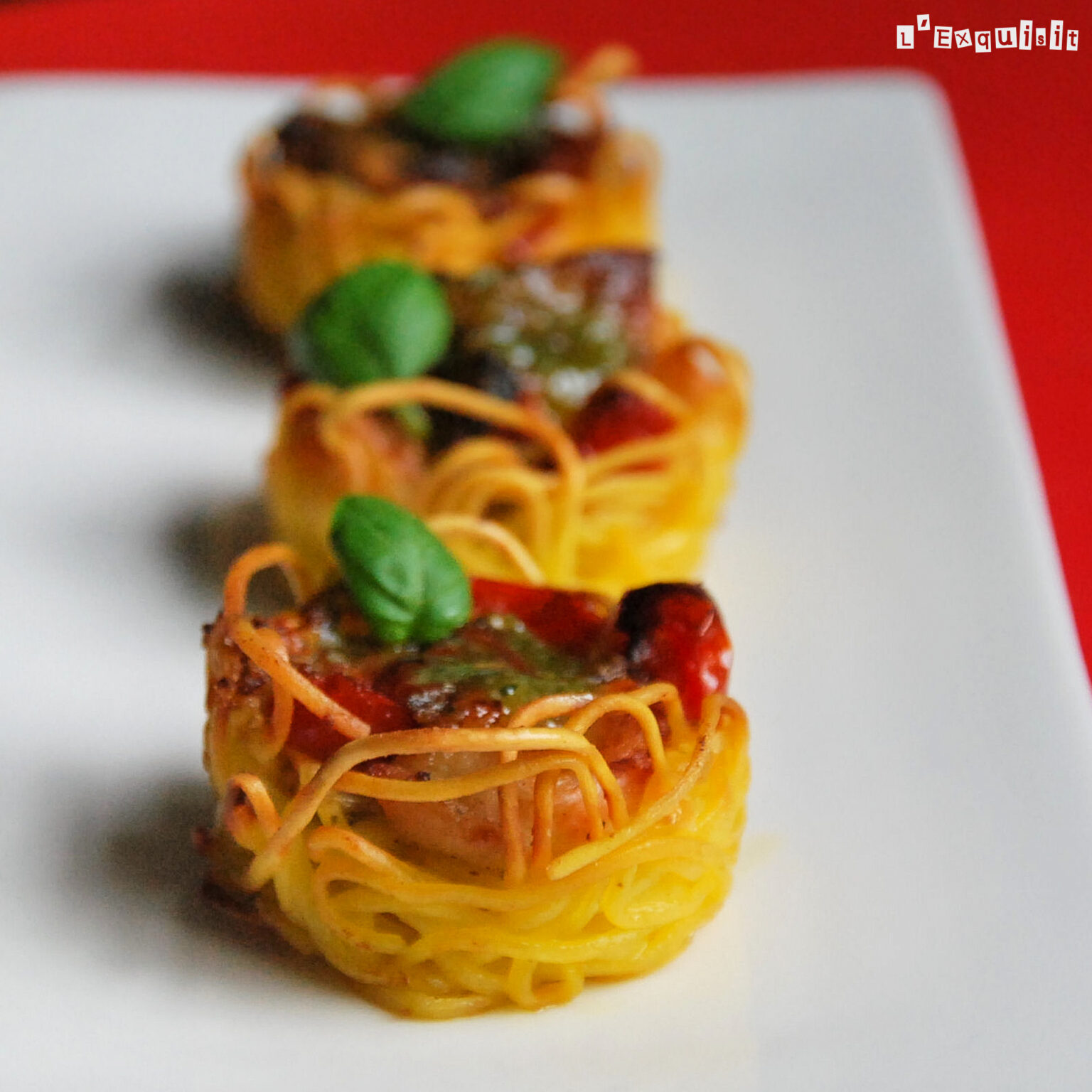 Hornear 15 minutos a 180 grados. Sacarlos de horno y rellenar con 2 daditos de pollo, cuatro trocitos de tomate y dos daditos de mozzarella. Agregar ½ c/c de pesto. Seguir horneando durante 10-15 minutos, hasta que los fideos se vean dorados. Sacar del horno, poner ½ c/c más de pesto en cada nido, decorar con una hoja de albahaca y servir.