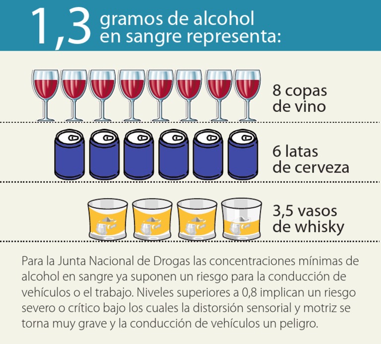 La concentración de alcohol en la sangre se mide en gramos de alcohol por litro de sangre (g/l). Para metabolizar un nivel de 0,5 g/l, se necesitarían alrededor de cuatro a cinco horas. En el caso de una persona con un nivel de 1 g/l (estado de embriaguez), podrían requerirse unas 10 horas para que descienda hasta el nivel máximo permitido.