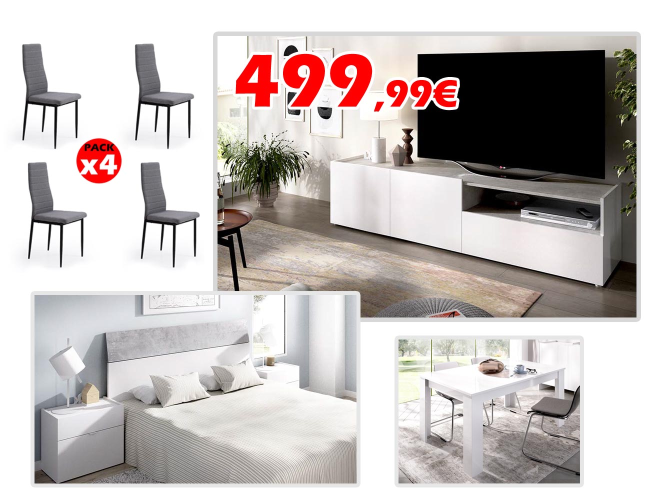 Piso completo blanco. Oferta piso completo blanco, incluye un mueble de salón blanco y grafito, una mesa extensible de comedor, un pack de cuatro sillas de salón, una mesa de centro elevable y un conjunto de dos mesitas de noche con cabecero. 509,00 €. En lugar de 532,00 €.