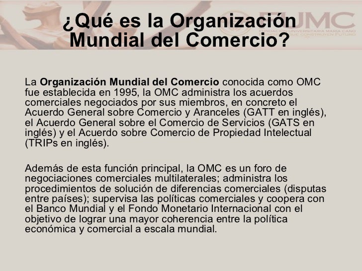 ¿Qué es la Organización Mundial de Comercio? La Organización Mundial de Comercio (OMC) es, como su nombre lo dice una organización internacional