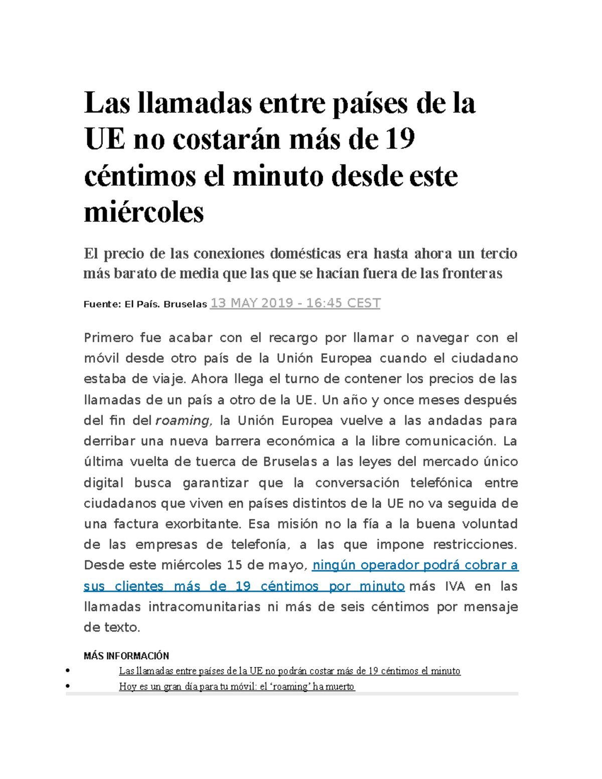 Directiva roaming practica Las llamadas entre países de la UE no costarán más de 19 céntimos