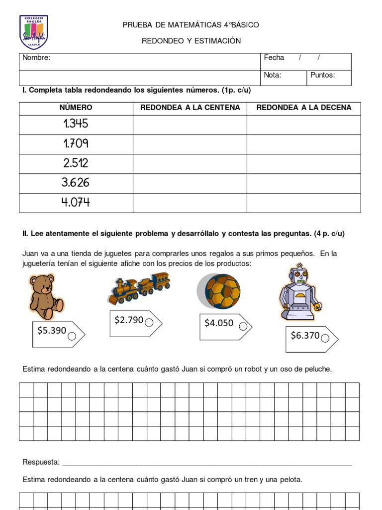Prueba de Matemáticas 4° básico Estimar y redondear